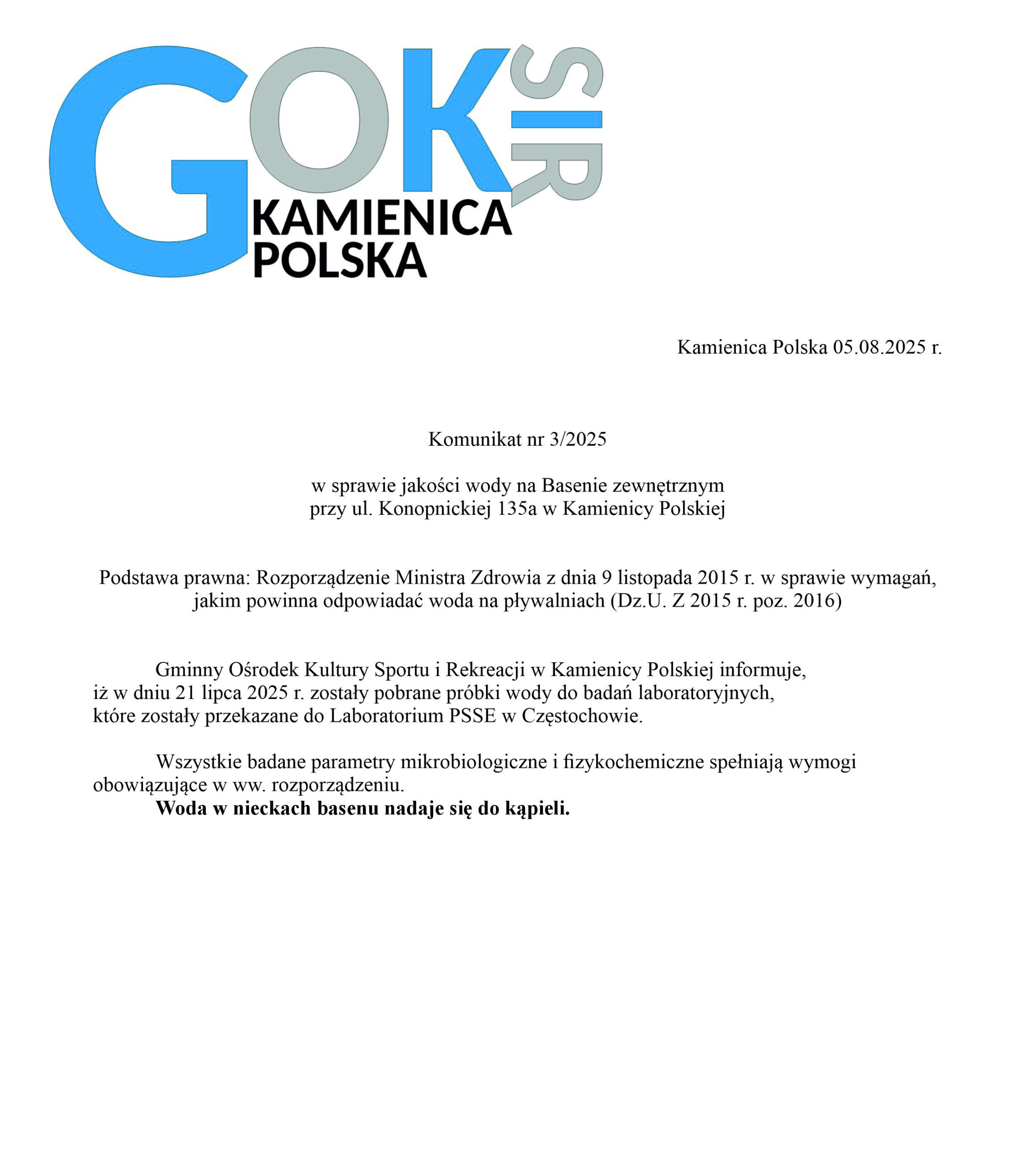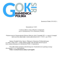 Kamienica Polska, 08.08.2024 Komunikat nr 3/2024 w sprawie jakości wody na Basenie zewnętrznym przy ul. Konopnickiej 135a w Kamienicy Polskiej Podstawa prawna: […]
