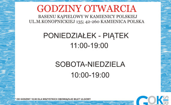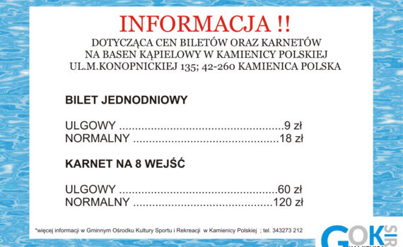 REGULAMIN BASENU KĄPIELOWEGO 1. Zarządcą Basenu Kąpielowego jest Gminny Ośrodek Kultury, Sportu i Rekreacji w Kamienicy Polskiej. 2. Basen Kąpielowy jest otwarty od poniedziałku do piątku w godz.11.00-19.00, sobota – niedziela w godz. 10.00 – 19.00 z wyjątkiem: a) organizacji imprez sportowych (zawody), b) przerw konserwacyjno-remontowych, c) awarii itp. […]